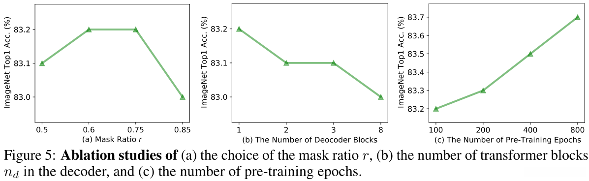 从图5(a)可以看出,在掩码率r介于0.5至0.85时本文的方法表现非常稳定,并与文献[22]中的观察结果一致。图5(b)中还研究了解码器深度对性能的影响。值得注意的是,在其他条件相同的情况下实验发现使用较少的解码器块可以获得更好的性能效果。这项研究更倾向于采用SimMIM[66]中基于层次模型的简单预测头设计,并与采用各向同性模型的MAE[22]进行比较。为了实现简洁性和高效性,在整篇论文中我们设置了r=0.75并将解码器块的数量固定为1个阶段,并对预训练预算对本方法的影响进行了深入研究。如图5(c)所示,在微调过程中准确度随训练epoch数量稳步提升且并未出现停滞现象这表明该方法具有进一步优化性能的空间