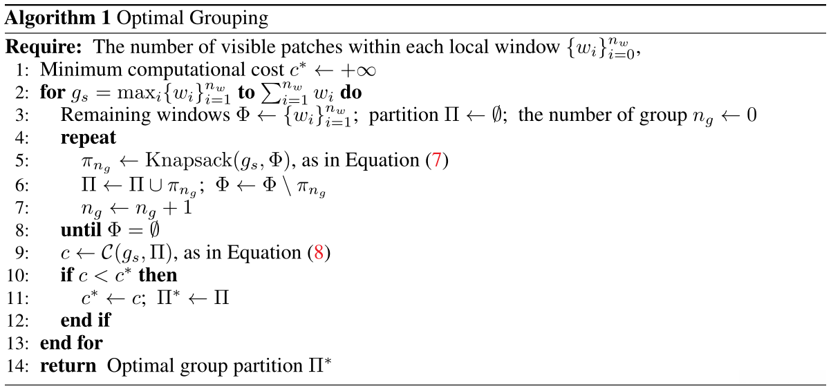 在此基础上我们进一步将上述的子群体划分转化为一个约束优化问题其目标是最小化对分群tokens所施加注意力计算的成本同时借鉴动态规划思想[4]以及贪心算法原理本文设计并实现了一种最优子群体划分算法这种算法能够自适应地选择合适的子群体尺寸从而实现最少数量的子群体划分以达到降低整体注意力计算开销的目的。