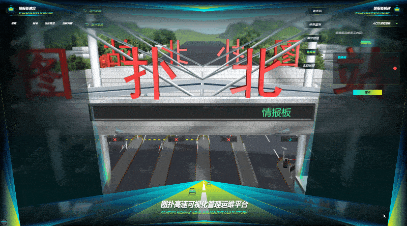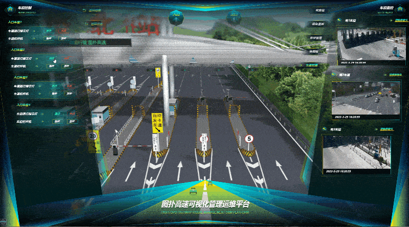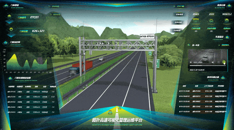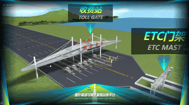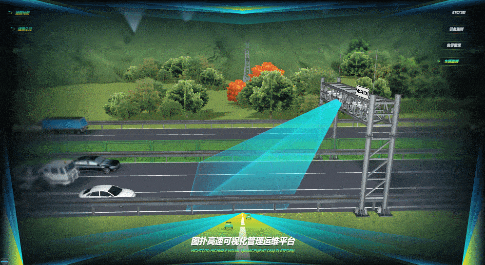 图扑高速可视化管理运维平台中的 ETC 门架系统同样可具备通行车辆分段计费、流量调查、视频监控、超速筛查等功能,汽车经过门架之后,门架上安装的监控系统会自动识别汽车,同时实现计费。
