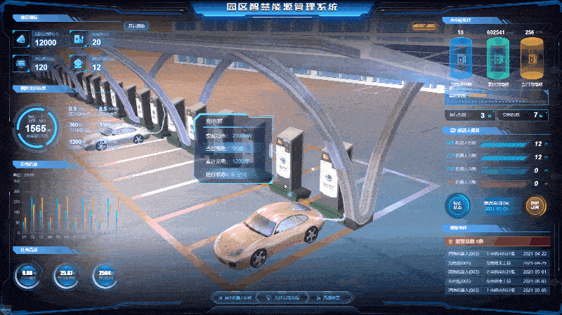 休息区停车场为了更贴合如今市场需求,增设了许多充电桩以解决新能源电动车的临时充电情况。服务区可通过图扑可视化实时监测电桩运行状态及实时功率,对接充电桩的充电状态,判断当前车位是否有车辆,通过线条流动效果动画模拟充电状态。在充电桩发生故障时,通过模型染色、告警动画等效果提示,为充电桩的实时使用情况和运行监控维护提供了便利。