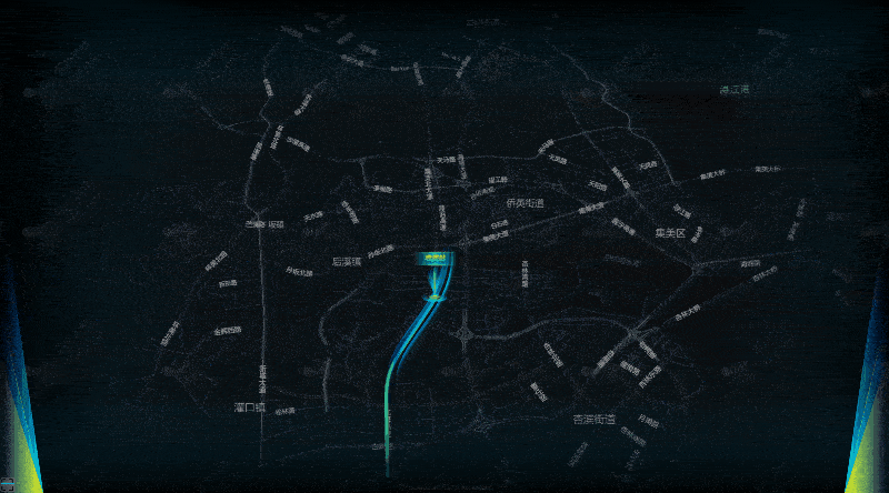 随着画面初始化后,映入眼帘的是以沈海高速厦门至泉州段作为项目背景的可视化场景,流光溢彩的霓虹效果展示了高速公路在 GIS 地图上的走向,以动画延伸的方式进行展示,让人眼前一亮。配合底部公路动画效果样式图,更贴合了整个项目场景。