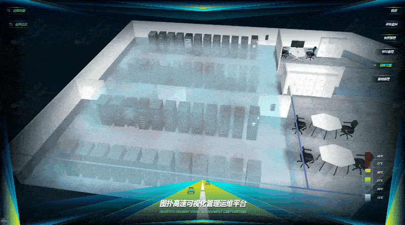 通过对接数据中心内的物联网设备(温湿度传感器),获取到场景中的温度点位信息,渲染出三维的热力云图效果。目前很多数据中心已经垂直安装使用了低中高垂直方向的传感器,传统的热力云图是将渲染出来的图片贴合到平面地板上,使用三维的热力云图,可以带来更直观的视觉体验,可以更快定位每个机柜上的设备发热情况。