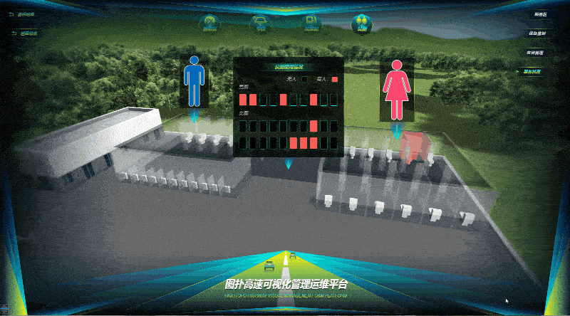 服务区卫生间也实现了智慧化升级,可实现实时空余厕位数量的显示,有效引导旅客避开如厕高峰。运维人员通过图扑 Hightopo 可视化可实时查看公厕的使用情况等数据,便于安排保洁进行厕所消杀等清洁工作。