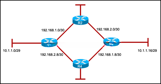 | 流量会在两条路径(R2-R1 和 R2-R3)间进行负载均衡。 | |