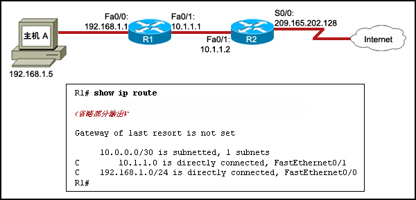 使用 R2 Fa0/0 的 IP 地址在 R1 上配置一条默认路由。