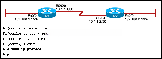 47.请参见图示。 为实施 RIPv2 协议,网络管理员运行了所示命令。 但是, show ip protocol 命令未显示任何输出。 管理员应如何解决该命令没有输出的问题? |