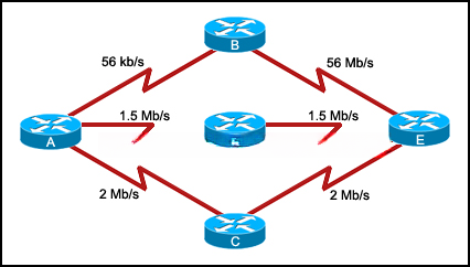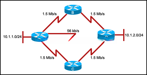 33.请参见图示。 所有路由器都已正确配置为使用 EIGRP 路由协议(使用默认设置),并且网络已完全收敛。 下列哪种说法正确描述了流量从 10.1.1.0/24 网络到 10.1.2.0/24 网络会使用的路径?