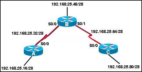 | 4.网络管理员在所示网络图中的路由器 B 和 C 上启用了 RIP。什么命令可防止向路由器 A 发送 RIP 更新? |