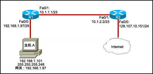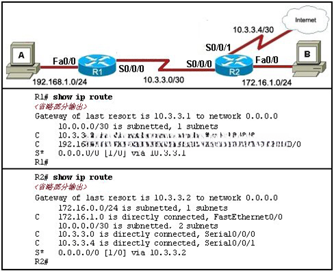 11.请参见图示。 尽管 R2 已配置正确,但主机 A 还是无法访问 Internet。 可以在 R1 上配置哪两条可让主机 A 访问 Internet 的静态路由?(选择两项。) |