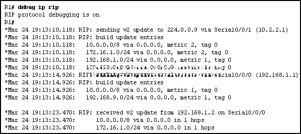 | 46.请参见图示。 尝试诊断网络中的路由问题时,网络管理员运行了 debug ip rip 命令。 根据此命令的输出,我们可以得出什么结论? |