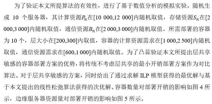 图5展示了服务器资源的提升对部署开销的影响,将资源大小随倍数增加,随着存储空间、计算资源和通信资源的增加,同一个服务器上可部署的容器数量也会逐渐增加,越来越多的容器可以被部署在同一个服务器上,潜在地能够共享更多的层,从而降低容器的总部署开销,而无层共享的方案则一直需要相同的部署开销。实验结果证明了层共享在部署开销上的优势,当存储空间、计算资源和通信资源增加到一定程度时,所有容器可以部署在一个或少数几个服务器上,此时松弛算法和最优解取得了相同结果。