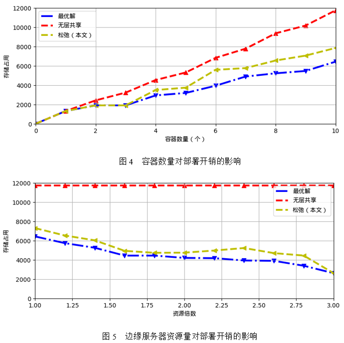 如4 图所示,当容器数量较少时,能够共享的层数量有限导致规划空间有限,松弛算法几乎可以得到与最优解相同的结果。随着容器数量的增加,占用的空间也越来越多,因此总消耗呈上升趋势。但是由图4可以看出,采用层共享方法存储的方式可以使开销得到明显降低,容器数量越多,优势越明显。这是因为,随着容器数量的增加,可共享的层越来越多,层共享的优势也越来越明显。