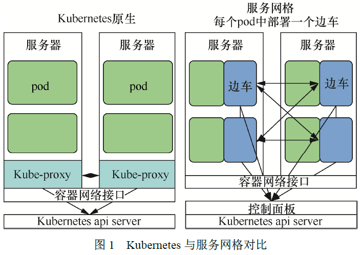 尽管在很多情况下Kubernetes能够完成微服务治理功能,但开发者仍然会遇到其他问题。在实际生产环境中,由于微服务的实现方式不同,如果要使微服务之间进行通信,开发者需要预先协调通信接口和方式。此外,流量的管控与调度由于要考虑环境中的各种因素,所以开发过程并不简单。因此, 服务网格应运而生**[19]** 。Kubernetes与服务网格对比如图1 所示,作为服务之间通信的基础设施层,服务网格可以分离微服务中的通用功能,如服务注册发现、负载均衡、熔断降级、流量管理、监控等功能,极大地补充了Kubernetes使用时的一些不足。