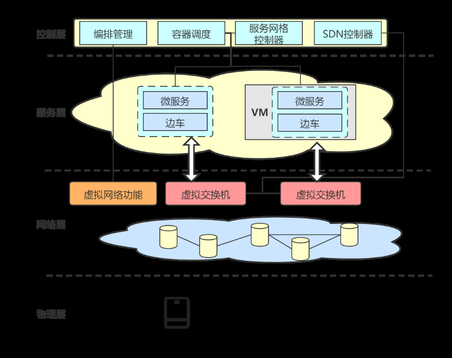 由于物理层资源的广分布特征,使得网络成为串联各类异构资源的核心。同时,如前所述,传统封闭刚性的网络技术阻碍了边缘计算应用的开放式发展。因此,在本文提出的全栈式网络架构中, 为实现算网协同的资源调度,单独抽象一层独立的网络层。网络层不仅包括交换机、路由器等基础通信物理设施,还包括驱动软件定义网络功能实现的各类基础软件(如Open vSwitch等)以及各类虚拟****网络功能。