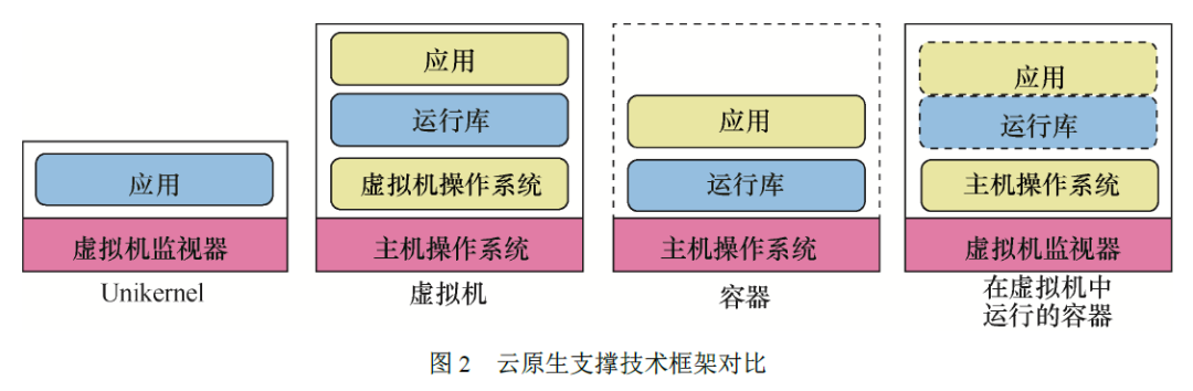 ①体积小,Unikernel只需要包含应用所必须的依赖和包,大大减小了自身的体积;②速度快,由于Unikernel中没有其他不必要的程序,有效减少了多进程之间的任务切换和启动,使得中央处理器(CPU,central processing unit)能够高效运行,启动速度也非常快,通常只有20mm甚至几毫秒,使它在用户需要时进行启动响应。Unikernel也由此被视为实现云原生的重要支撑技术之一。