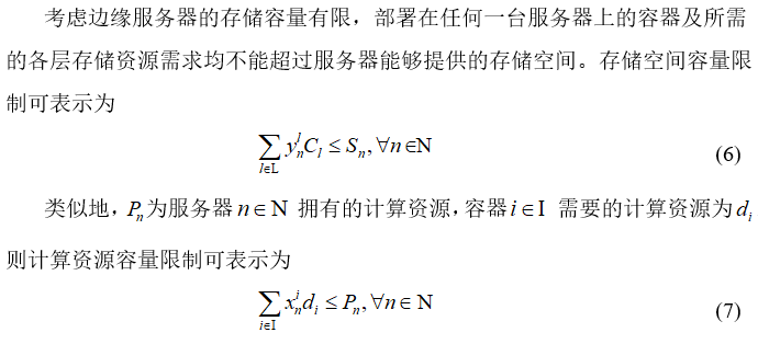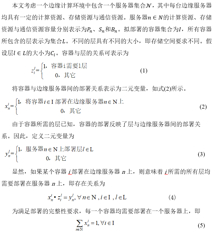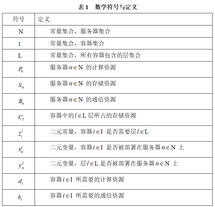 边缘计算环境中的分布式服务器的资源有限, 同时需要部署的容器具有不同的计算与存储资源需求,如何综合考虑容器的分层特性,实现边缘计算环境中的低开销容器部署,对云原生边缘计算具有重要意义。首先构建分层敏感的低开销容器部署优化理论模型,为便于读者理解,总结了模型中涉及的数学符号与其定义,数学符号与定义如表1所示。
