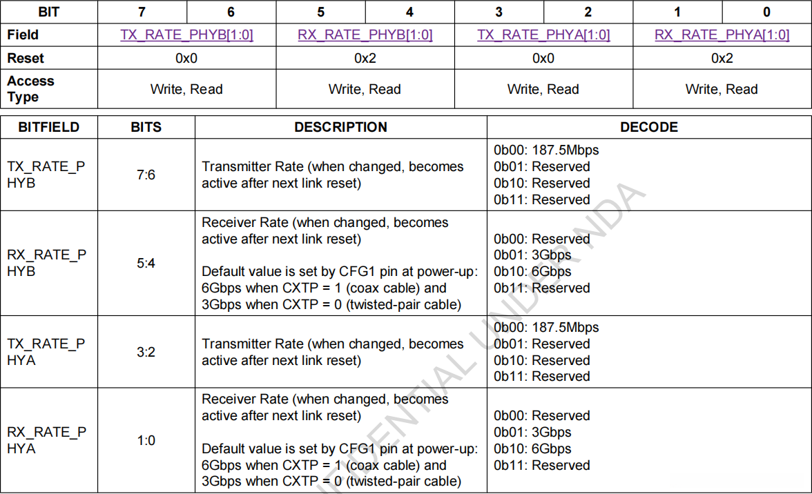 将reg26与reg27分别设置为十六进制数0x11后,在此基础之上可得出结论:由此导致PORT A、B、C、D各端口的数据接收速率达到30.48 Gbps(即3Gbps),而控制信号发送速率为每秒约187.5 Mbps;若某一路link需配置为gmsl类型,则其相应的数据接收速率为60.48 Gbps