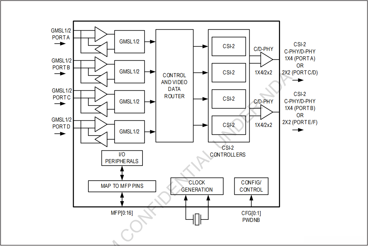- 将GMSL2/GMSL1的串行输入转换成MIPI CSI-2 的D-PHY/C-PHY接口输出
