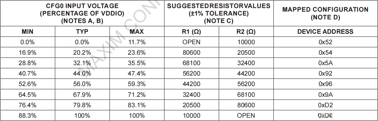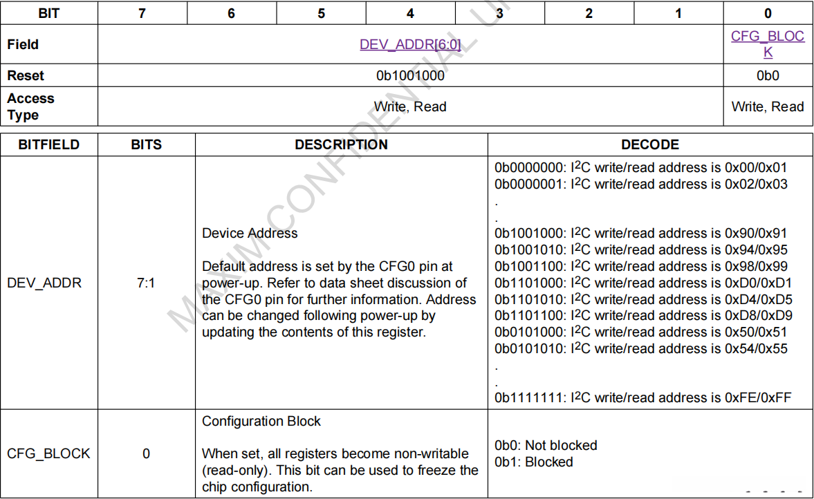 CFG₀配置设定了上电时的默认I₂C地址。通过在Default Address寄存器( DEV_ADDR )中设置当前值(当前值为 ) ,可以修改I₂C总线地址。本项目的实际操作中使用的数值设定为 ** (十进制:) ,因此在完成上述操作后, 实际连接到系统中的I₂C总线设备将使用新的Default Address值(即 ** (十进制:) ,十六进制表示:$ )。
