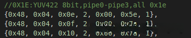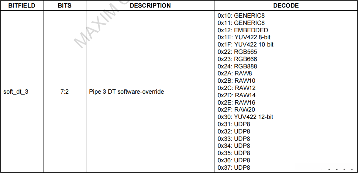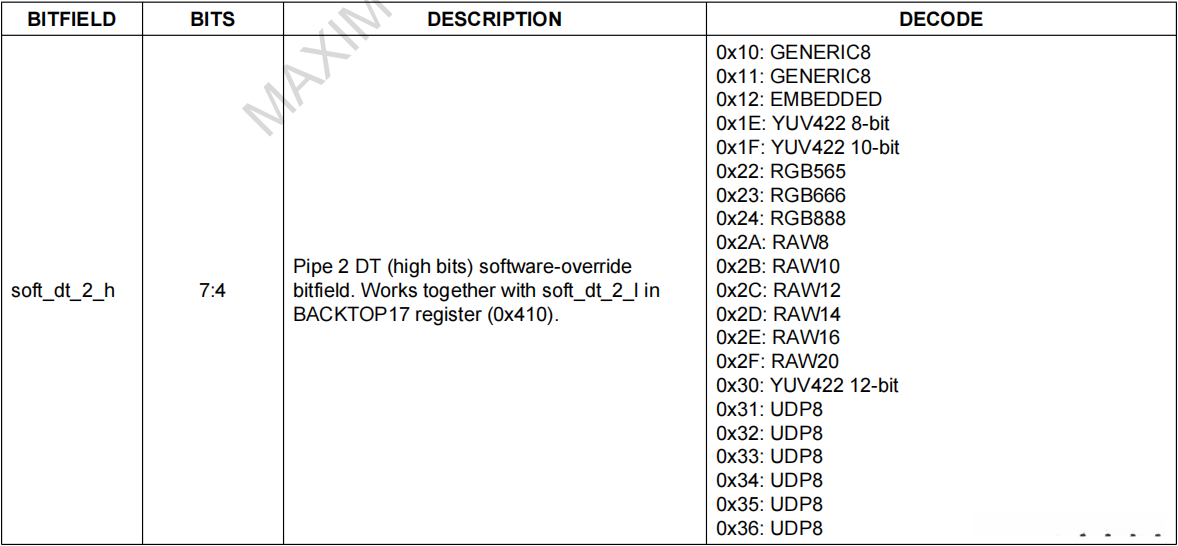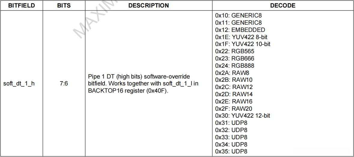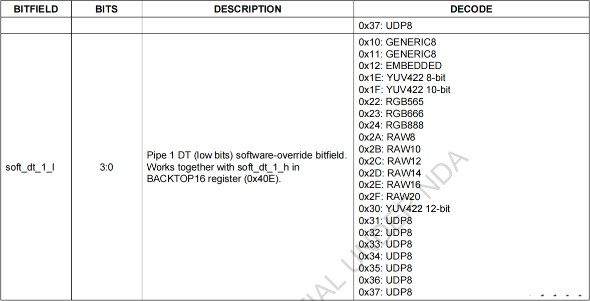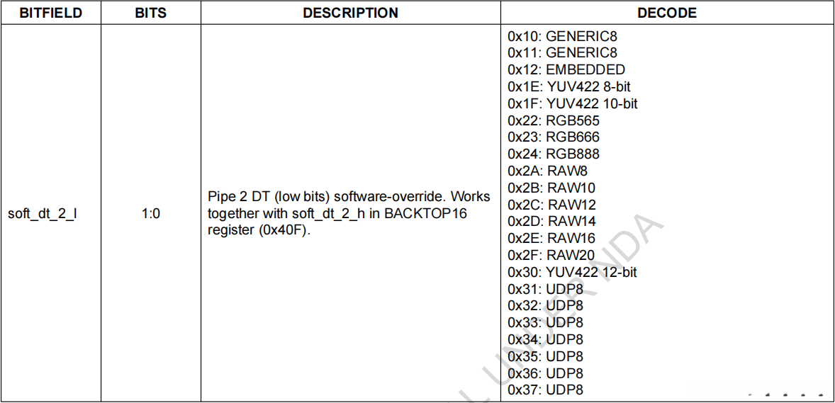 这三个传感器除了 soft_dt_1_h 位于地址 0x40E 的前五位外(其中 soft_dt_1_h = 0x5e ),即前五位对应的是YUV422 8bits的形式;其他如 PIPE_1 等传感器则需要将两个寄存器结合起来查看数据格式