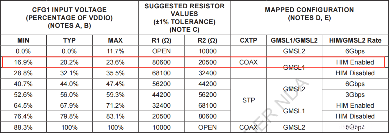 可参考上方所示的CFG1电路图。可以看出我们的上电预设配置如图中标示。COAX/GMSL1/HIM Eanbled