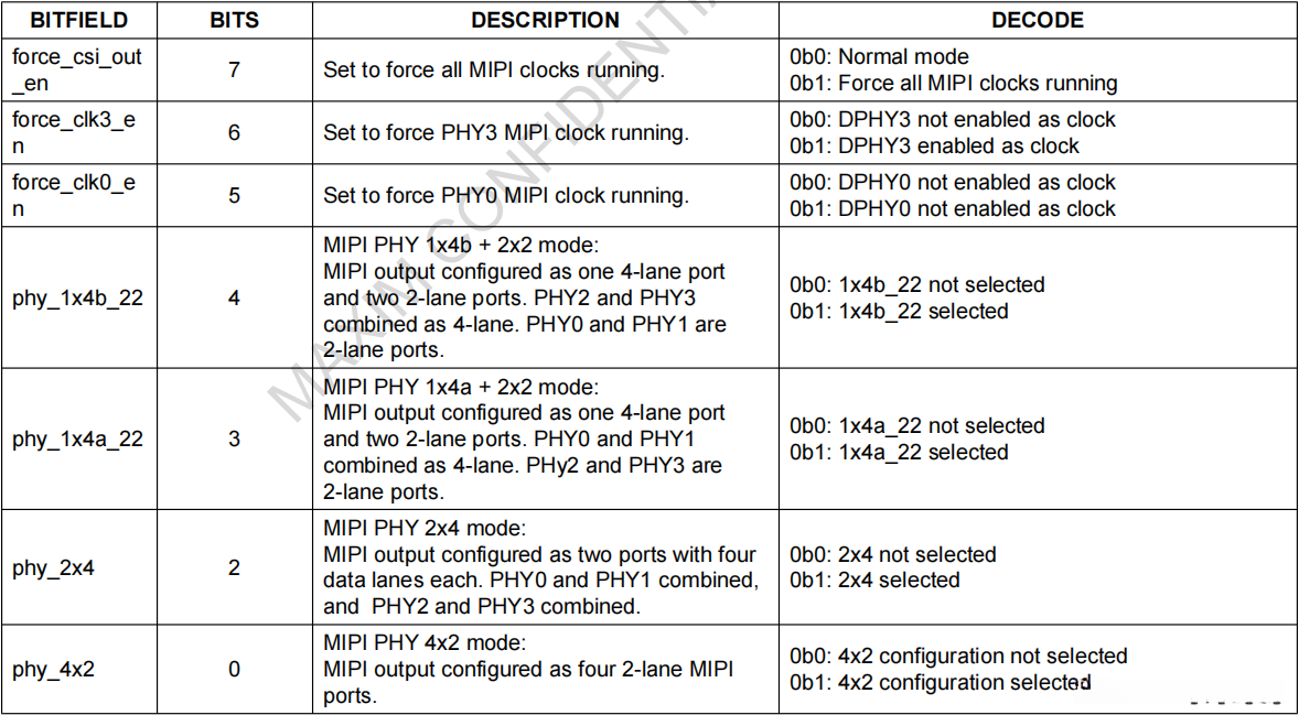 如上图0x04的配置对应为MIPI PHY配置为2个4 lane phy模式