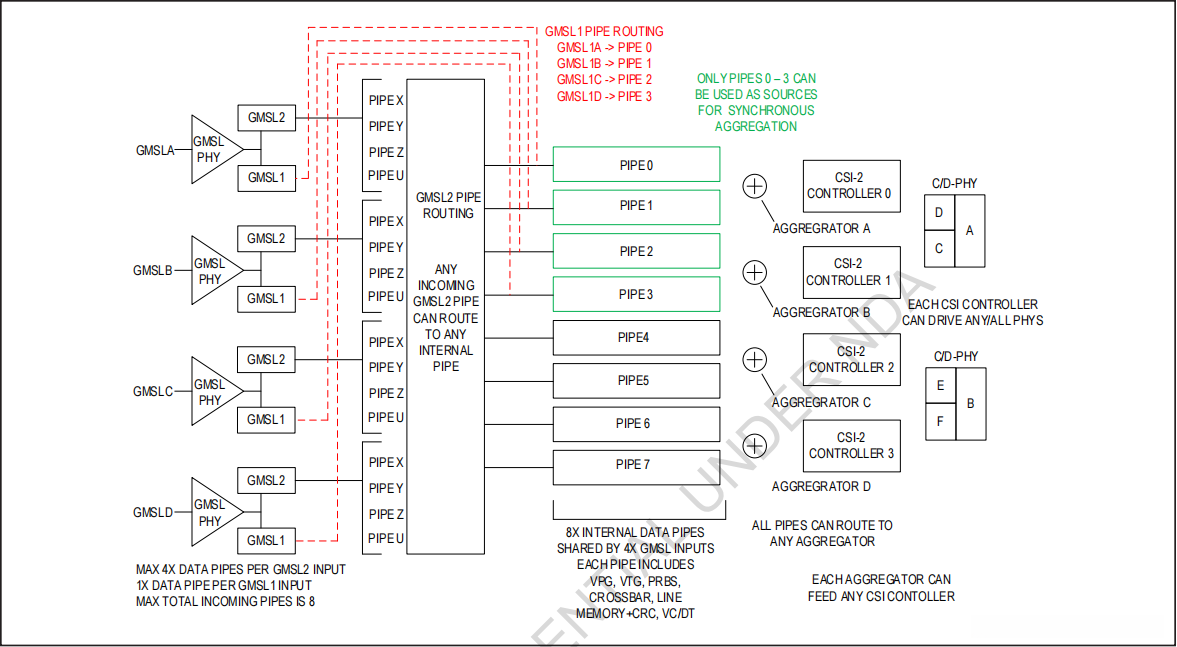 每个GMSL2输入最多可连接4个 incoming PIPES(PIPEX, PIPEY, PIPEZ, PIPEU),然而总的 incoming pipes最大为8个