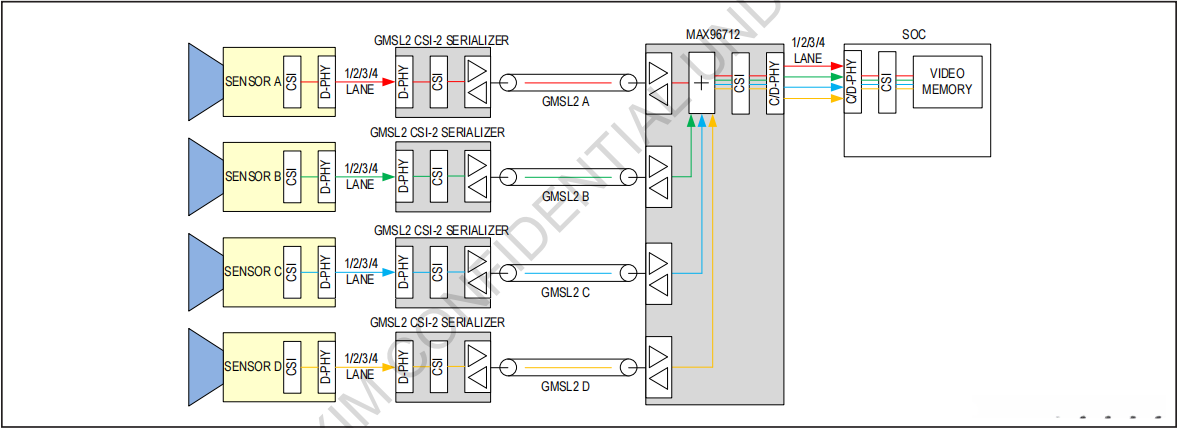 - MAX96712支持视频数据的聚合和复制,使来自多个远程传感器的流能够被组合并路由到一个或多个可用的CSI-2输出