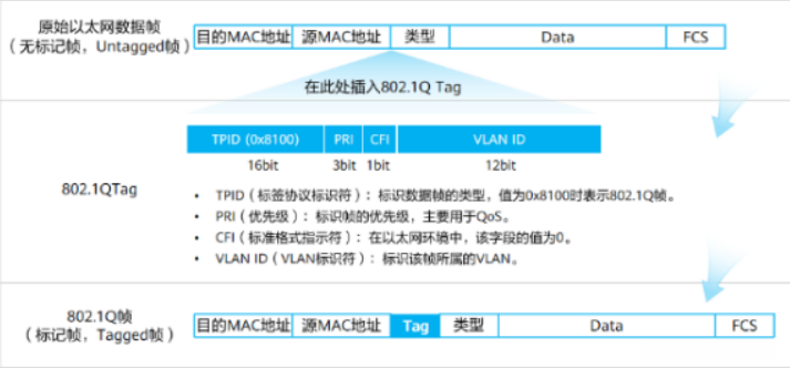 数据从主机发出后,交换机会收到此数据帧,会给此数据帧打上一个vlan tag(tag中的vlan ID就是交 换机收到数据帧接口的vlan ID),此时数据帧变成了一个802.1q格式的帧。
