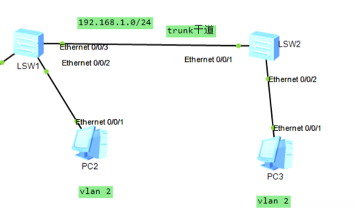 2、trunk:交换机之间的级联、路由器、防火墙等设备的子接口,可以放通多个vlan