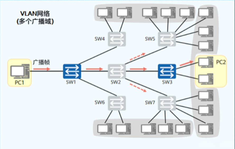 VLAN作用:将一个大的广播域划分成若干个小的广播域,减少了广播风暴的出现