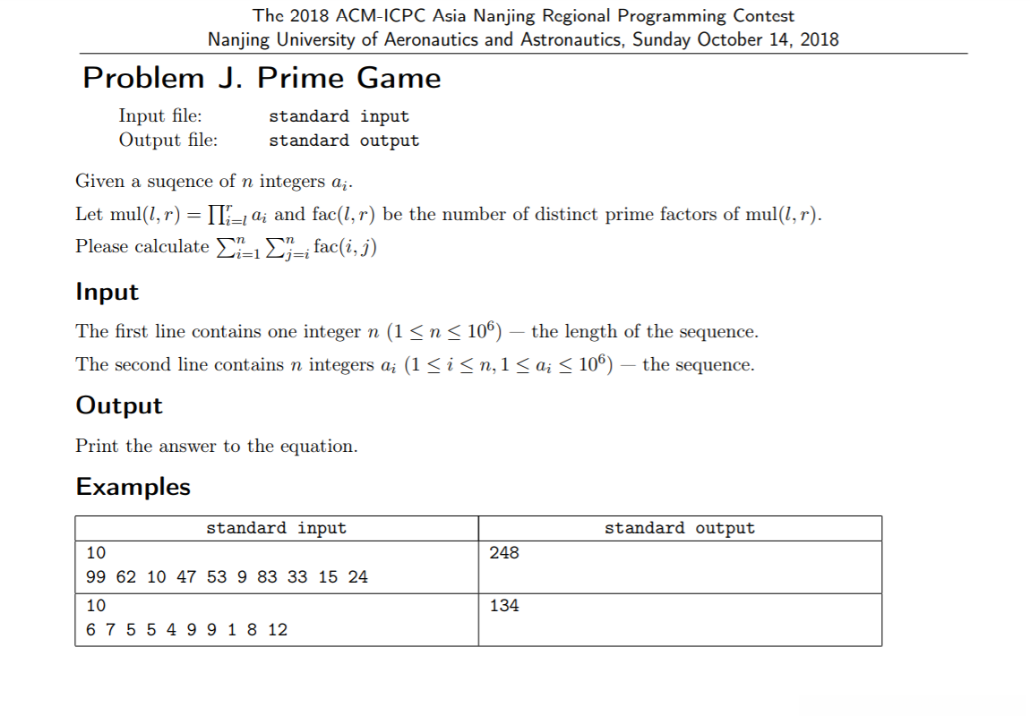 思路:我们需要计算每个质因数的贡献。首先对所有素数进行筛选,在此基础上对每个数字进行质因数分解。从而我们可以获得该数字所包含的素因子。接着我们需要计算每个因子在区间内的贡献程度。具体可以看代码,在此基础之上我们还需要持续更新这些素因子的位置信息。
