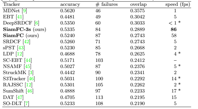 可以发现SiamFC和SiamFc-3s均排名较高,其中前者可达58fps,后者可达86fps。具体见表: