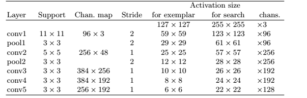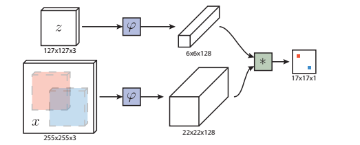 该算法采用了全卷积式的Siamese网络,作者在文中给出了简化版的网络结构,其中卷积层分别是对模板图像和搜索图像进行的操作,共5层,然后利用一种相似性度量函数将两个矩阵合并成一个得分矩阵。如图: