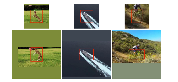 s的变换方式是在原有尺寸不变的前提下填充原图RGB各通道均值像素,而待搜索图像则也是以目标区域为中心,都是从视频中选取的与模板图像相差不超过T帧的图像。