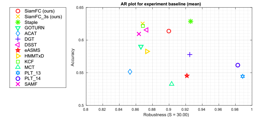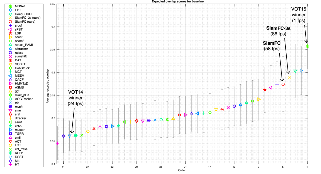 作者在写这篇文章的时候,2016的官方结果还没出,作者自己测试的结果是SiamFc和SiamFc-3s的预测重叠率分别是0.3876和0.4051。