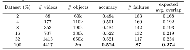 作者后面还通过不断改变数据集大小来观察测试效果的不同,发现数据集越大,目标预测效果越好结果见表: