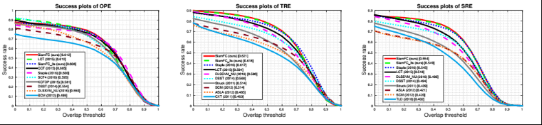 在OTB-13的测试中,作者将其中的25%对样本图像转化为了灰度图像,其余不变,最终效果如图,可以发现SiamFC和SiamFC-3s的效果都居于前两名。其中单次成功率OPE可达0.62,时间鲁棒性TRE(将不同帧打乱)可达0.612,而空间鲁棒性SRE(从帧内不同框位置开始)可达0.564。