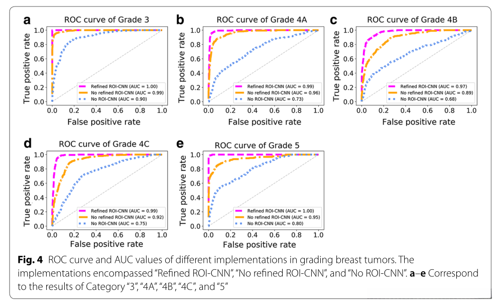 此外,请参考图4中的曲线图。这些不同预测区域来自实验"No ROI-CNN"、"No 改进的 ROI-CNN"以及改进后的"Improved ROI-CNN"。通过观察各类别的ROC曲线变化情况可以看出,在所有实验中"AUC最大的 Improved ROI-CNN"能够实现最佳分类效果。相比之下,在G-CNN中仅提供低质量区域输入数据的"No 改进的 ROI-CNN"与"No ROI-CNN"实验表现较差。特别地,在评估各分类器性能时发现:随着区域质量降低,AUC值也随之下降。具体而言,在表2中可以看到,No ROI-CNN提供的最低相似性特征在所有测试用例中均表现出最差的结果。基于此,综合比较DSC、AvgDist、HDist指标以及ROC曲线的变化趋势,采用改进版"IRO-CNN"算法能够显著提升感兴趣区域定位性能
