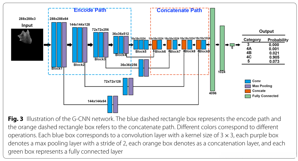 通常,纹理和边界信息在低层卷积层中得到很好的表征,并且用更多的卷积层可以很好地提取基本特征。在我们提出的G-CNN中,来自不同深度的特征地图被连接在一起,以充分利用低层和高层信息。参考图3,G-CNN模型由9个模块组成。前四个块(从模块1到模块4)形成编码路径。编码路径中的每个模块共享相同的结构,该结构包含两个卷积层和一个最大池层。在编码路径中,卷积层的特征通道数量在最大池层之后增加了一倍。编码路径接着是包含三个卷积层的模块5。然后,拼接路径之后是四个相同的模块(从模块6到模块9)。拼接路径中的每个模块块由拼接层和卷积层组成。在我们的G-CNN模型中,来自较低层的特征地图还与来自较深层的特征地图相连接。利用编码路径中的每个模块为拼接路径中的相应块提供低级特征。例如,模块3和模块7拼接在一起。注意,为了确保导入到级联层的两个输入的大小是一致的,编码路径中的前三个块后跟卷积层和最大池层。