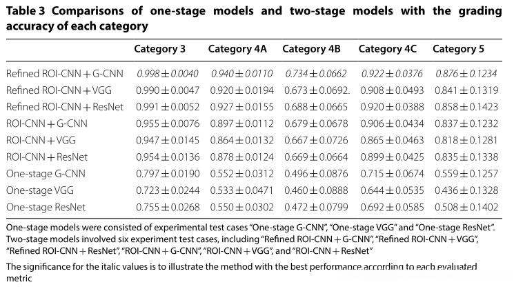 表3详细记录了one-stage与two-stage实验在各肿瘤类别中的分级准确度数据。one-stage方法指的是无需识别阶段直接从标准图像(尺寸288×288)预测至五个类别。两阶段法则要求在分类过程中额外引入一个识别阶段以辅助任务完成。两阶段法可分为两种类型:一种是带有改进过程的方法另一种是非改进型的方法。采用改进过程的两阶段法包括以下几种实验案例:"改进型ROI-CNN + G-CNN""改进型ROI-CNN + VGG"及"改进型ROI-CNN + ResNet"等项目。未采用改进措施的两阶段法则涉及以下几种实验案例:"常规ROI-CNN + G-CNN""常规ROI-CNN + VGG"及"常规ROI-CNN + ResNet"等方案