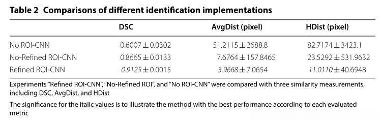 在我们的实验方法中采用改进型ROI-CNN模型进行参数配置。(1)在公式(4)中对μ₁、μ₂以及α赋值均为1;(2)其轮廓演化迭代的最大次数设定为50次。此外,在C–V水平集模型中所使用的参数设定与我们改进后的ROI模型一致。值得注意的是,在‘No ROI-CNN’实验中将其最大轮廓演化迭代次数设定为了1000次。