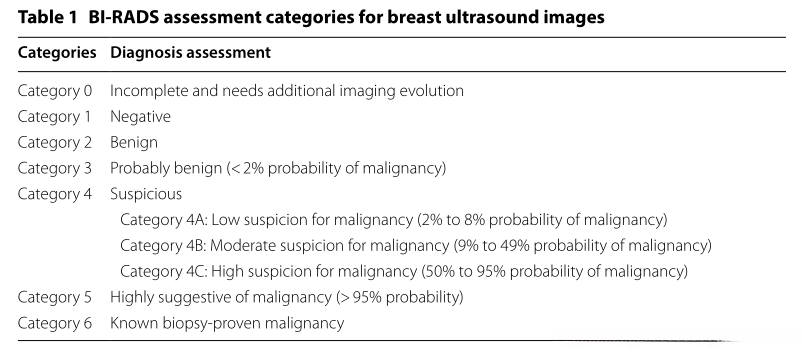 乳腺癌已成为全球女性中最常见的发病率和死亡原因之一[1-3]。通过实施筛查超声技术来减少不必要的检查频率、节省相关成本并减轻受检查者的焦虑水平[4,5],该方法已成为大多数常规检查和临床诊断的标准手段[6-9]。在医学影像学领域中,乳腺成像报告和数据系统(BI-RADS)[10]为医生根据医学图像准确判断乳腺肿瘤类型提供了标准化参考依据及指导原则。根据表1所列评估标准以及中国成都四川大学华西医院指导委员会成员在临床实践中的广泛经验,在超声评估过程中主要可分为三级、四级及五级评价体系[10]。其中一至二级评价指标表明超声检查未发现任何恶性病变迹象,则建议实施另一种适合年龄范围的常规筛查方式。而六级则特指活组织取样检查结果呈阳性的情况。值得注意的是,在临床实践中尤其关注的是四级病变患者(见表1),因为这类患者的恶性风险介于2%至95%之间具有显著不确定性。基于此,在分级诊断方面可将其进一步划分为四级A、B、C三个亚类[10]。对于接受过相关转诊的患者而言,在完成活检后应依据实际情况做出合理的诊疗决策考虑因素包括患者的医疗期望与现实需求等多方面因素的影响)。从医疗专业角度出发设计一个自动化的乳腺肿瘤分级方案至少应具备以下功能:能够客观地对第3级至第5级病变进行诊断判断包括四级亚类(见表1)的内容)。然而需要注意的是尽管BI-RADS提供了重要的参考框架但不同个体可能因主观判断差异导致最终诊断结论存在分歧因此开发自动化分类系统不仅有助于减轻人工诊断的工作负担还能有效降低个体诊断偏差带来的影响