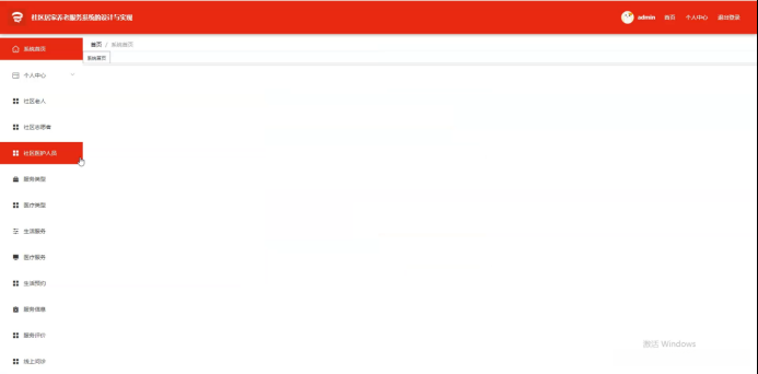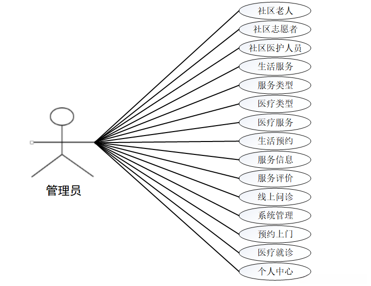 管理员登录主页后的主要职责是完成个人中心管理以及对社区老人的健康关注等各项事务。该模块涵盖服务类型设定与管理、医疗类型划分与配置等内容,并提供生活服务预约安排以及相关的评价反馈机制。此外还包含线上问诊预约和上门服务的安排流程,并支持医疗就诊记录的查询与更新功能。系统管理则负责后台数据维护与安全防护工作。具体功能分布如图5-7所示