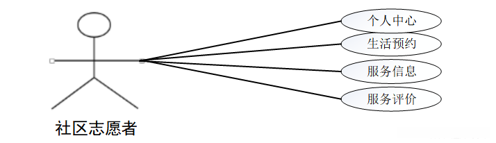 (3)、社区志愿者的核心功能涵盖个人中心、生活预约、服务信息以及服务评价等模块进行日常运作。社区志愿者用例如下: