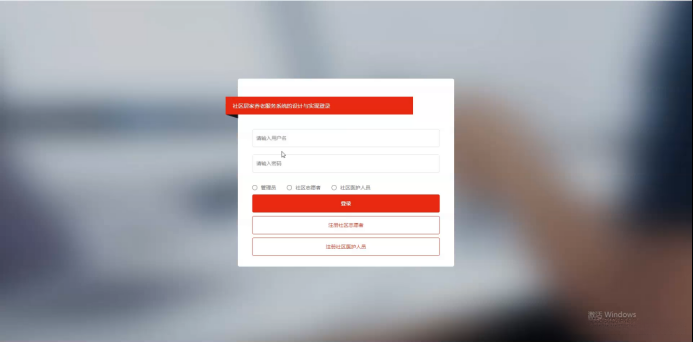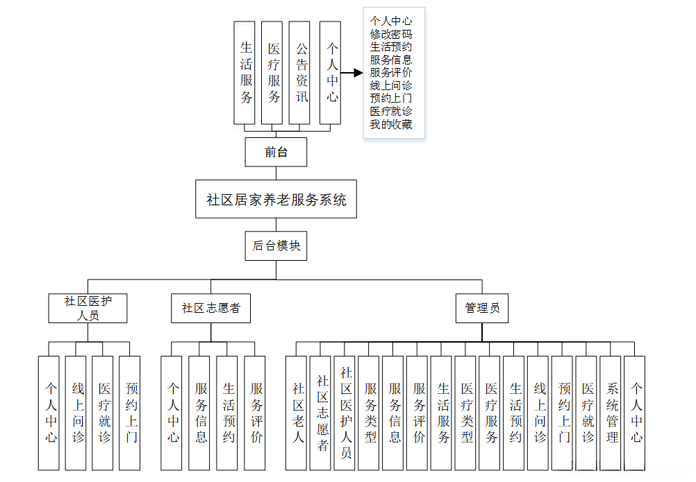 划分为四个功能模块:社区老人、社区志愿者、社区医护人员以及管理员。