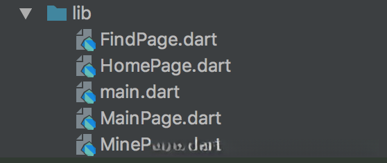 涉及的主要文件包括main.dart负责程序启动以及四个辅助功能模块: MainPage.dart主要用于显示主界面(类似于Android中的MainActivity),HomePge.dart用于显示首页, FindPage TFT用于展示发现页面, MinePge dart则用于呈现我的页面