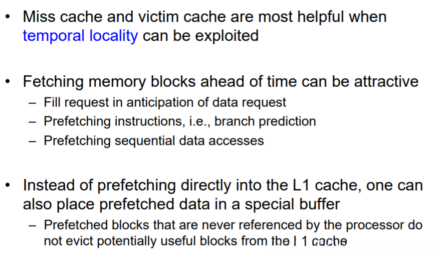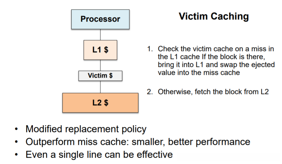 Victim Cache: L1中被替换掉的line放在Victim中,并非miss cache