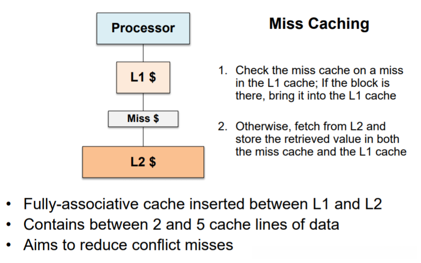 Miss Cache: 2-5 lines, 复制L2中的line同时存在L1和miss cache中。