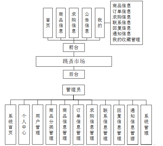 跳蚤市场的使用者主要有两类用户,一类是管理员,他拥有整个系统的最高权限,然后是用户,只能对自己的个人信息进行操作。系统根据这两类用户,划分出了两大功能模块。